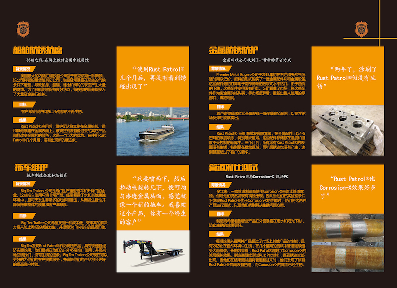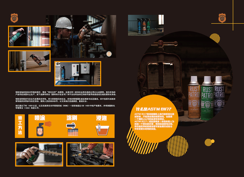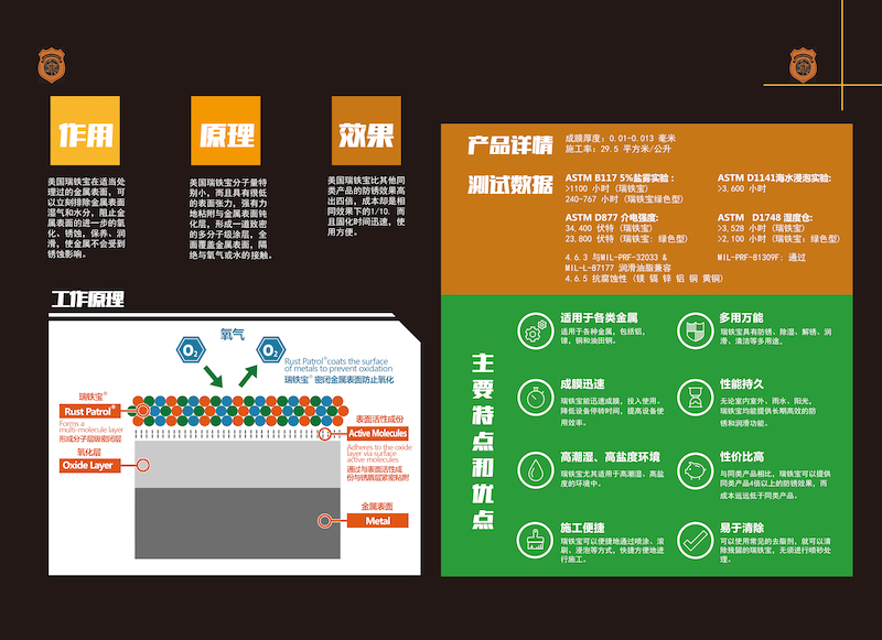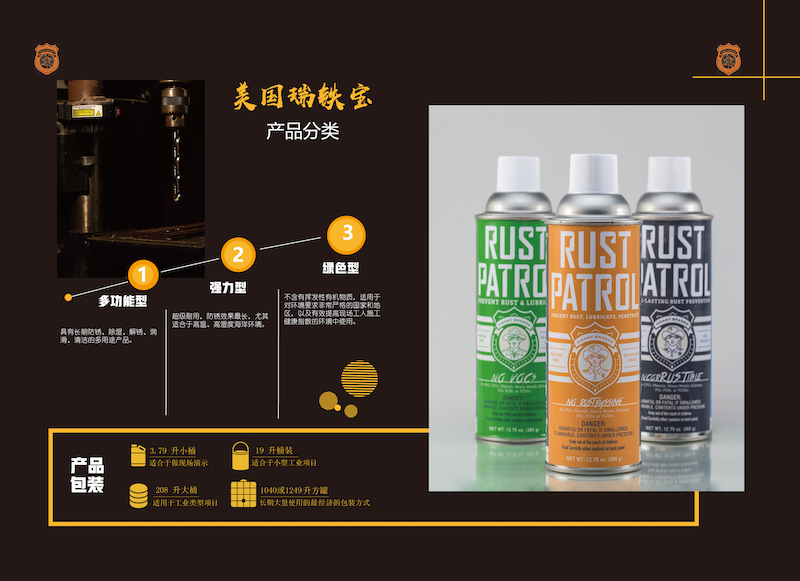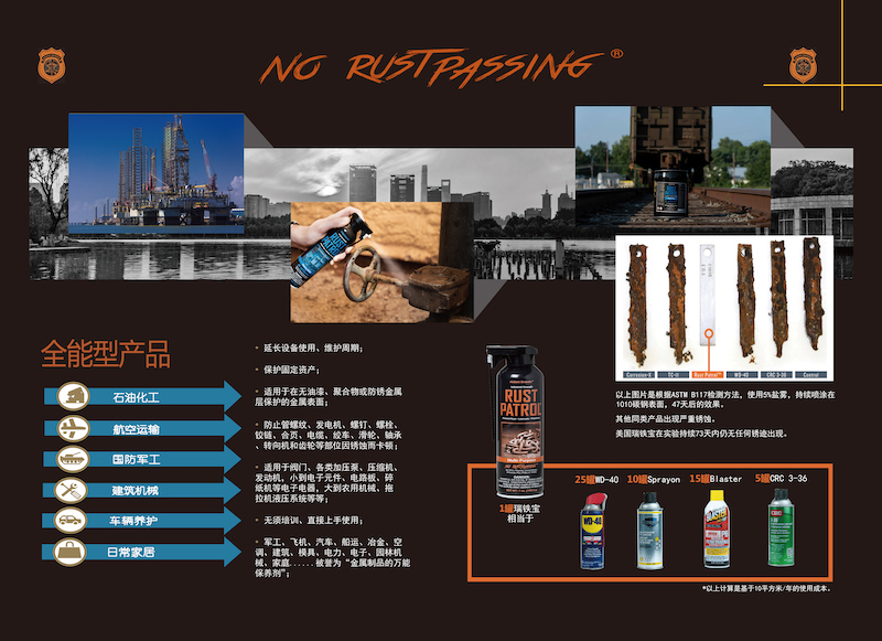 RustPatrol(瑞铁宝)万能防锈润滑系列产品,可在恶劣的自然环境下防锈、润滑、解锈、除湿,尤其适用于高潮湿、高盐度的环境中。广泛应用于国防、能源、船舶、运输、仓储、农业、制造业和航空航天领域。是集各种功能于一体的高性能、高科技产品!